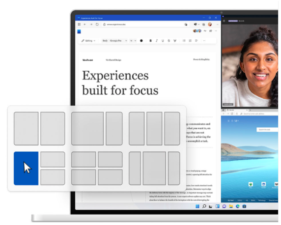 Snap layouts is designed to make multi-window work easier by giving users six different preset layouts for between 2 to 4 windows. Just click to choose the layout you want, and the windows automatically snap into place.